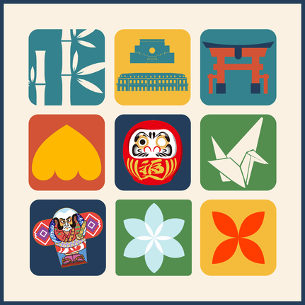 Bildnachweise: Daruma, Samurai-Drache: CC0 (unsplash - mos_design); Lotus, Blume, Fächer: CC0 (unsplash - Sigmund); Warabekan&Wilhelmsbad, Origami, Plakat Vis-à-Vis, Plakat Aus-allen-Nähten, Bambus: © HPUSM; Karte_Japan: © Warabekan;